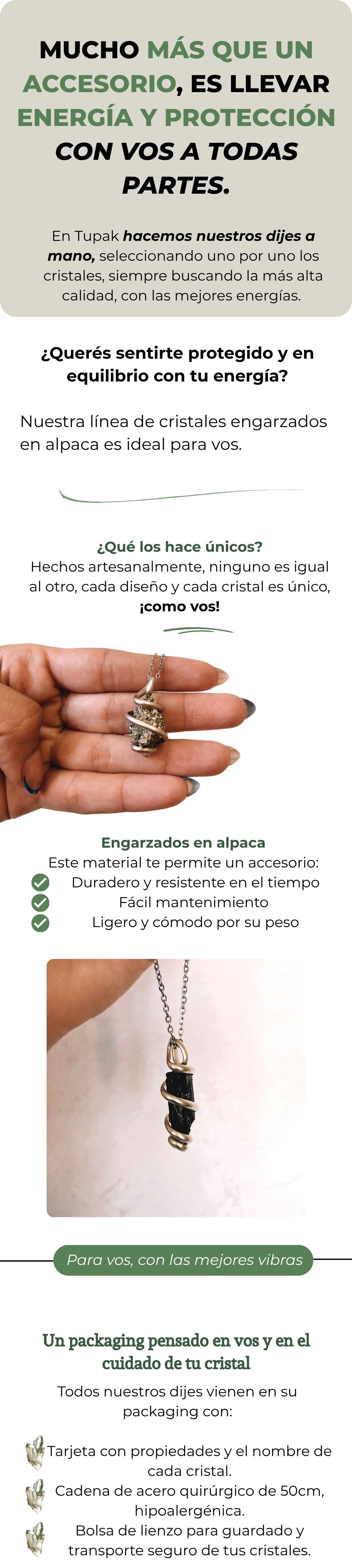 Cada dije es elaborado artesanalmente por nosotros con alambre de alpaca, engarzando cristales auténticos y seleccionados manualmente.